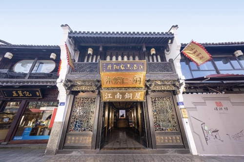 以朱炳仁團(tuán)隊(duì)打造的銅屋系列為例:入駐亳都·新象的“中原銅屋”是其全國(guó)第四家、華中第一家銅屋。建筑內(nèi)部以超高、超寬的銅板工藝打造出“銅盒子”視覺(jué)焦點(diǎn),磚木結(jié)構(gòu)搭配著銅與玻璃的碰撞,產(chǎn)生時(shí)空交錯(cuò)的美感。“中原銅屋”整體風(fēng)格和中原民居相適配,當(dāng)訪客的指尖掠過(guò)帶有紋飾的銅器,恰似完成一場(chǎng)跨越三千年的文明對(duì)話——要知道,商城遺址曾出土過(guò)杜嶺方鼎等商代青銅文明的巔峰之作,這份地域文化根脈在此得到了呼應(yīng)。